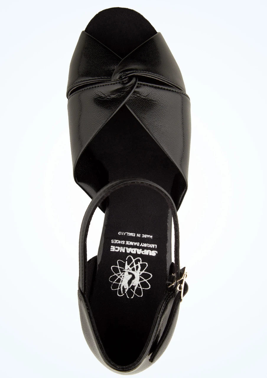 High quality sophisticated latin sandal from Supadance. Crossover vamp detail with peep toe design makes this shoe pretty and practical. Features a roller huck buckle so the shoe can be adjusted to fit.