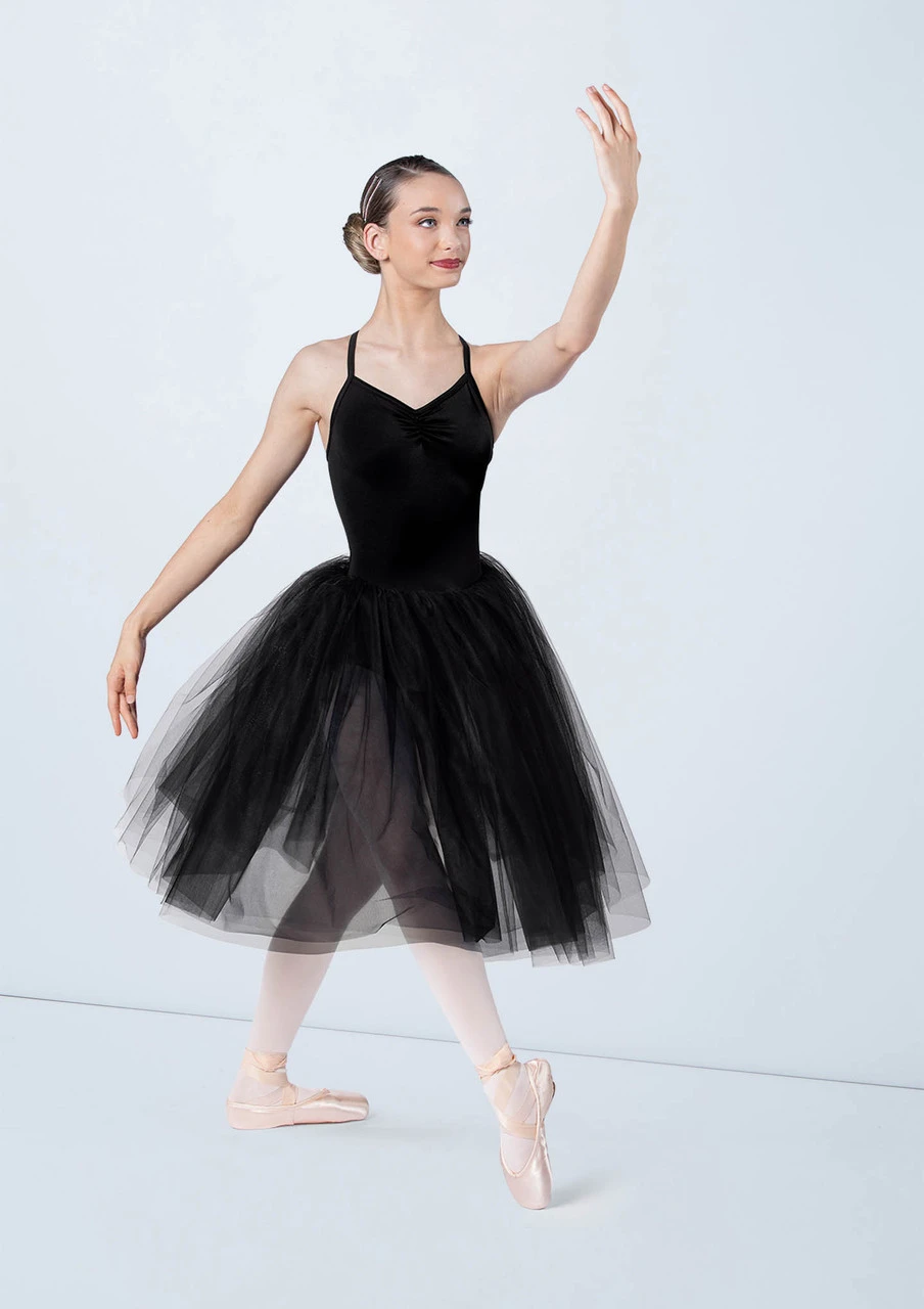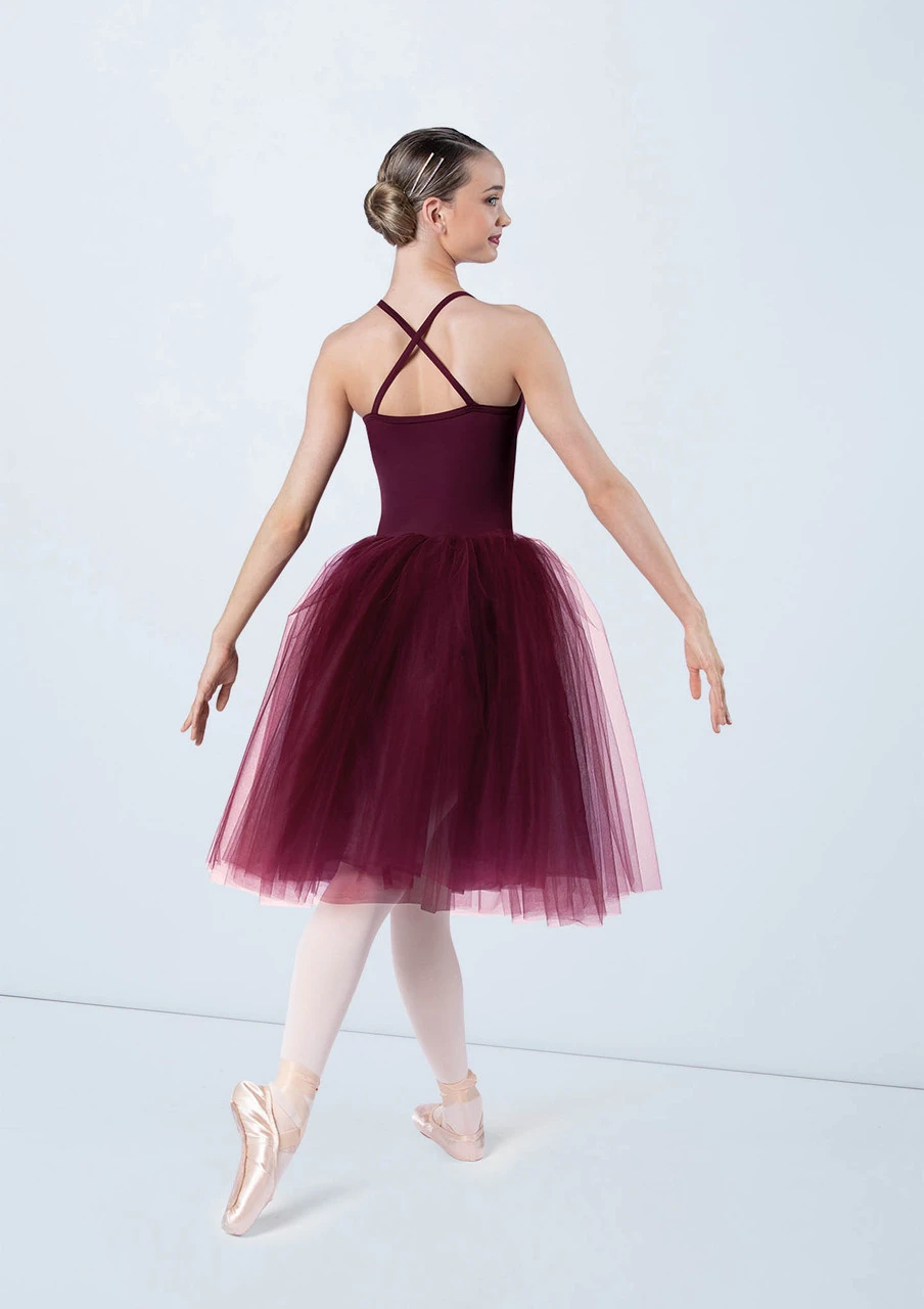 -Romantic-length tutu is layered tulle over tricot