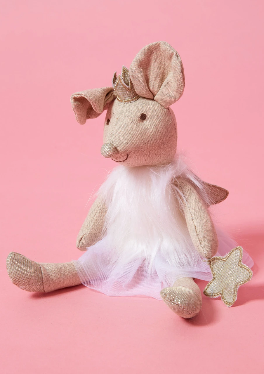 A dainty dancer mouse with a gold crown. Featuring big mouse ears and a gold star. We love Lea Mouse’s fur top and matching white tutu.